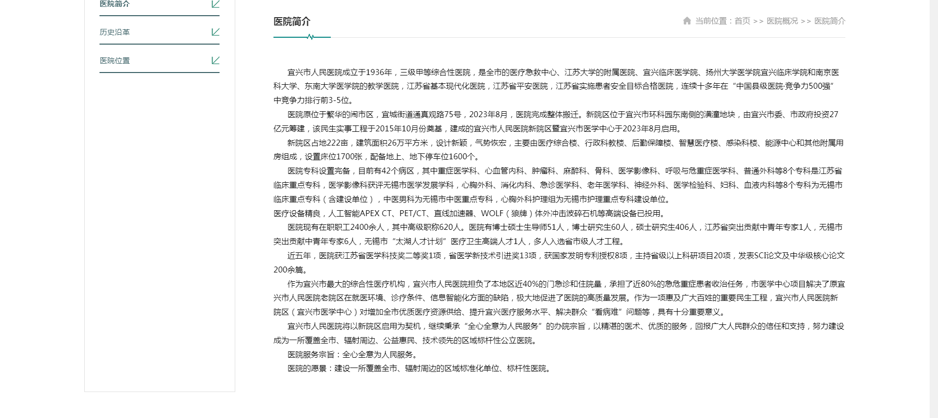 宜興市人民醫(yī)院成立于1936年,三級甲等綜合性醫(yī)院,是全市的醫(yī)療急救中心、江蘇大學(xué)的附屬醫(yī)院、宜興臨床醫(yī)學(xué)院、揚州大學(xué)醫(yī)學(xué)院宜興臨床學(xué)院和南京醫(yī)科大學(xué)、東南大學(xué)醫(yī)學(xué)院的教學(xué)醫(yī)院,江蘇省基本現(xiàn)代化醫(yī)院,江蘇省平安醫(yī)院,江蘇省實施患者安全目標(biāo)合格醫(yī)院,連續(xù)十多年在“中國縣級醫(yī)院·競爭力500強”中競爭力排行前3-5位。 醫(yī)院原位于繁華的鬧市區(qū),宜城街道通真觀路75號,2023年8月,醫(yī)院完成整體搬遷。新院區(qū)位于宜興市環(huán)科園東南側(cè)的潢潼地塊,由宜興市委、市政府投資27億元籌建,該民生實事工程于2015年10月份奠基,建成的宜興市人民醫(yī)院新院區(qū)暨宜興市醫(yī)學(xué)中心于2023年8月啟用。 新院區(qū)占地222畝,建筑面積26萬平方米,設(shè)計新穎,氣勢恢宏,主要由醫(yī)療綜合樓、行政科教樓、后勤保障樓、智慧醫(yī)療樓、感染科樓、能源中心和其他附屬用房組成,設(shè)置床位1700張,配備地上、地下停車位1600個。 醫(yī)院專科設(shè)置完備,目前有42個病區(qū),其中重癥醫(yī)學(xué)科、心血管內(nèi)科、腫瘤科、麻醉科、骨科、醫(yī)學(xué)影像科、呼吸與危重癥醫(yī)學(xué)科、普通外科等8個專科是江蘇省臨床重點??疲t(yī)學(xué)影像科獲評無錫市醫(yī)學(xué)發(fā)展學(xué)科,心胸外科、消化內(nèi)科、急診醫(yī)學(xué)科、老年醫(yī)學(xué)科、神經(jīng)外科、醫(yī)學(xué)檢驗科、婦科、血液內(nèi)科等8個??茷闊o錫市臨床重點??疲êㄔO(shè)單位),中醫(yī)男科為無錫市中醫(yī)重點???,心胸外科護(hù)理組為無錫市護(hù)理重點專科建設(shè)單位。 醫(yī)療設(shè)備精良,人工智能APEX CT、PET/CT、直線加速器、WOLF(狼牌)體外沖擊波碎石機等高端設(shè)備已投用。 醫(yī)院現(xiàn)有在職職工2400余人,其中高級職稱620人。醫(yī)院有博士碩士生導(dǎo)師51人,博士研究生60人,碩士研究生406人,江蘇省突出貢獻(xiàn)中青年專家1人,無錫市突出貢獻(xiàn)中青年專家6人,無錫市“太湖人才計劃”醫(yī)療衛(wèi)生高端人才1人,多人入選省市級人才工程。 近五年,醫(yī)院獲江蘇省醫(yī)學(xué)科技獎二等獎1項,省醫(yī)學(xué)新技術(shù)引進(jìn)獎13項,獲國家發(fā)明專利授權(quán)8項,主持省級以上科研項目20項,發(fā)表SCI論文及中華級核心論文200余篇。 作為宜興市最大的綜合性醫(yī)療機構(gòu),宜興市人民醫(yī)院擔(dān)負(fù)了本地區(qū)近40%的門急診和住院量,承擔(dān)了近80%的急危重癥患者收治任務(wù),市醫(yī)學(xué)中心項目解決了原宜興市人民醫(yī)院老院區(qū)在就醫(yī)環(huán)境、診療條件、信息智能化方面的缺陷,極大地促進(jìn)了醫(yī)院的高質(zhì)量發(fā)展。作為一項惠及廣大百姓的重要民生工程,宜興市人民醫(yī)院新院區(qū)(宜興市醫(yī)學(xué)中心)對增加全市優(yōu)質(zhì)醫(yī)療資源供給、提升宜興醫(yī)療服務(wù)水平、解決群眾“看病難”問題等,具有十分重要意義。 宜興市人民醫(yī)院將以新院區(qū)啟用為契機,繼續(xù)秉承“全心全意為人民服務(wù)”的辦院宗旨,以精湛的醫(yī)術(shù)、優(yōu)質(zhì)的服務(wù),回報廣大人民群眾的信任和支持,努力建設(shè)成為一所覆蓋全市、輻射周邊、公益惠民、技術(shù)領(lǐng)先的區(qū)域標(biāo)桿性公立醫(yī)院。