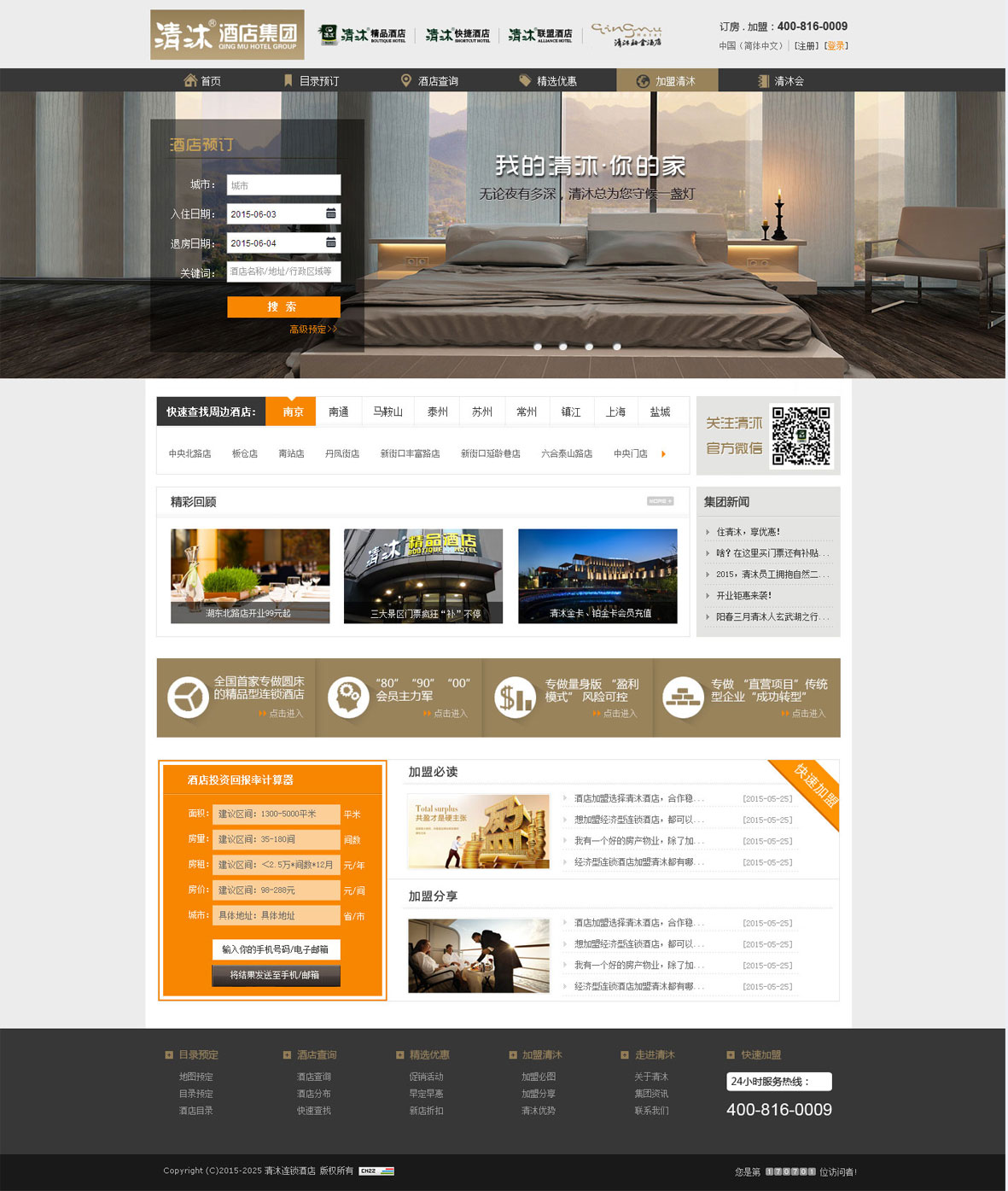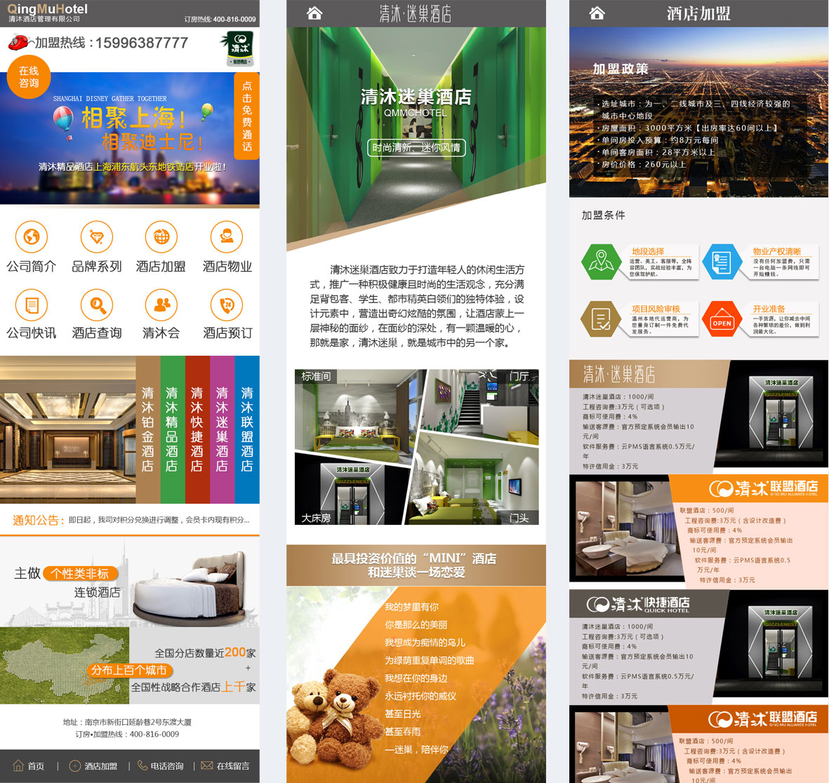 清沐酒店集團(tuán)創(chuàng)立于2005年,集團(tuán)位于文化底蘊(yùn)深厚的六朝古都-南京,是中國(guó)酒店業(yè)最具發(fā)展?jié)摿Φ谋就辆频?,清沐歷經(jīng)數(shù)年的成長(zhǎng),現(xiàn)已成功投資與管理了近200家連鎖酒店,發(fā)展足跡廣泛,遍布長(zhǎng)三角地區(qū)近百座主要城市。 清沐自成立以來(lái),在行業(yè)內(nèi)外鑄造了良好的品牌知名度,一直以誠(chéng)信和質(zhì)優(yōu)著稱(chēng)。清沐人至始至終以“讓清沐之燈照亮全國(guó)”為戰(zhàn)略愿景,堅(jiān)持“以人為本、誠(chéng)心誠(chéng)信、堅(jiān)持用心為每一位賓客提供周全的服務(wù)”為經(jīng)營(yíng)理念,清沐酒店已成為海內(nèi)外賓客最為喜愛(ài)的連鎖酒店品牌之一。 清沐酒店集團(tuán)目前旗下現(xiàn)擁有多個(gè)子公司及分公司,分別是:江蘇咖居酒店管理有限公司、上??Ь泳频旯芾碛邢薰?、南京富凱酒店有限公司、常州分公司、蘇州分公司、泰州分公司、鎮(zhèn)江分公司、合肥分公司、馬鞍山分公司、巢湖分公司等;經(jīng)營(yíng)的品牌有:清沐精選酒店、清沐鉑金酒店、咖居酒店、清沐聯(lián)盟酒店、清沐快捷酒店、清沐迷巢酒店等;并且現(xiàn)已著手開(kāi)發(fā)更多符合市場(chǎng)化、體驗(yàn)化的新的產(chǎn)品品牌文化,更好的服務(wù)每一位清沐的賓客。 清沐酒店集團(tuán)以其清麗悠然的墨綠作為門(mén)店的招牌主色調(diào),讓您第一眼就可感受到“清凈依然,如沐春風(fēng)”之感,您在清沐的每一天,都可以體會(huì)到家的溫馨與快樂(lè),我們將竭誠(chéng)為您帶來(lái)輕松度假、便捷商旅以及都市精品休閑的全方位舒適體驗(yàn),讓您盡情享受清沐“干凈、浪漫、時(shí)尚與貼心”的溫馨之旅。