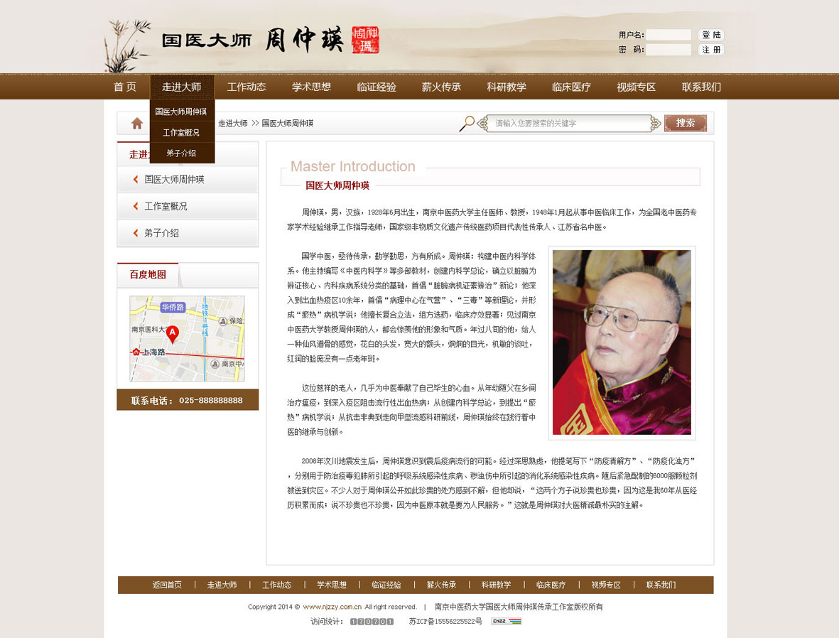 周仲瑛,男,漢族,1928年10月出生,南京中醫(yī)藥大學終身教授、主任醫(yī)師、博士生導師。世代中醫(yī),幼承庭訓,隨父周筱齋教授學習中醫(yī)。1948年開始從事中醫(yī)臨床工作,1956年進入南京中醫(yī)學院附屬醫(yī)院(江蘇省中醫(yī)院)工作,先后任住院醫(yī)師、講師、主治醫(yī)師、副教授、副主任醫(yī)師、主任醫(yī)師、副院長等職。1983年調(diào)任南京中醫(yī)學院,任院長。目前擔任中國中醫(yī)科學院學術委員、中華中醫(yī)藥學會終身理事、江蘇省中醫(yī)學會終身名譽會長等職。 周仲瑛教授是國務院首批政府特殊津貼獲得者、全國首批(1991年)、第三批(2003年)、第四批(2008年)和第五批(2012年)繼承老中醫(yī)專家學術經(jīng)驗導師,先后獲全國老中醫(yī)藥專家學術思想優(yōu)秀指導老師、全國優(yōu)秀中醫(yī)臨床人才研修項目優(yōu)秀指導老師、全國高等學校先進科技工作者稱號、全國優(yōu)秀研究生導師稱號、第一批國家級非物質(zhì)文化遺產(chǎn)項目"中醫(yī)診法"代表性傳承人、世界中醫(yī)藥學會聯(lián)合會首屆"王定一杯""中醫(yī)臨床國際貢獻獎"、全國首屆"國醫(yī)大師"等多項榮譽稱號。曾任七屆全國人大代表、國務院學位委員會學科評議組(中醫(yī))成員、國家中醫(yī)藥管理局中醫(yī)藥工作專家咨詢委員會委員、國家教委科技委醫(yī)藥衛(wèi)生學科組組員、衛(wèi)生部藥品審評委員會委員,江蘇省重點學科"中醫(yī)內(nèi)科學(急癥)"學科帶頭人等。曾受聘于新加坡中醫(yī)學院客座教授、廣東省中醫(yī)研究院客座研究員、浙江中醫(yī)學院附屬醫(yī)院學術顧問、天津中醫(yī)學院客座教授等職。